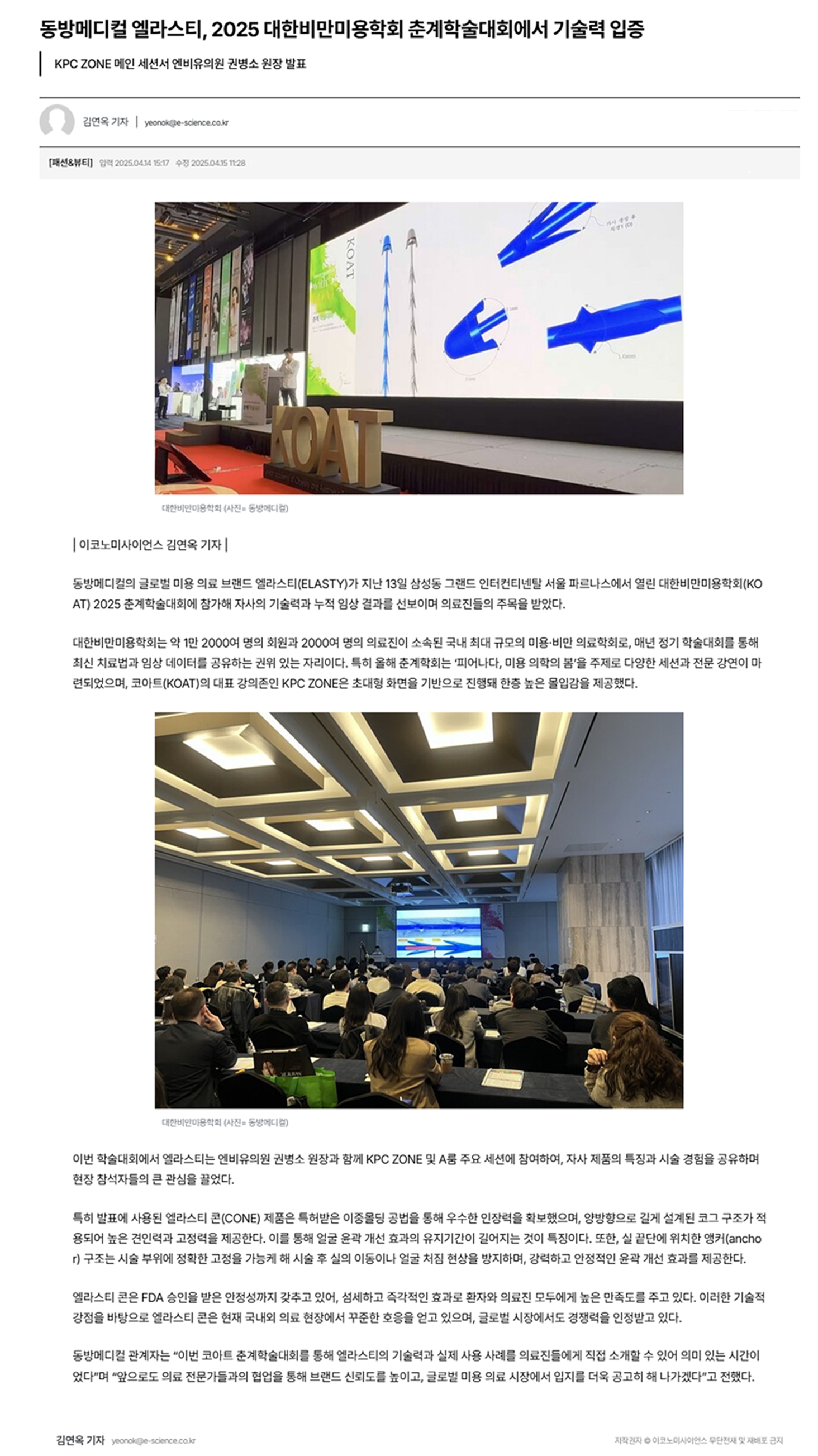 | 동방메디컬 엘라스티, 2025 대한비만미용학회 춘계학술대회에서 기술력 입증 | |||