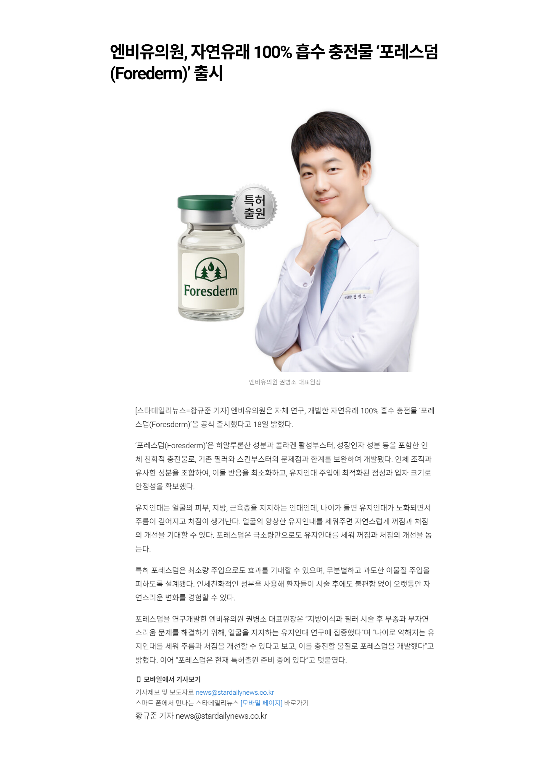 | 엔비유의원, 자연유래 100% 흡수 충전물 '포레스덤(Foresderm) 출시' | |||