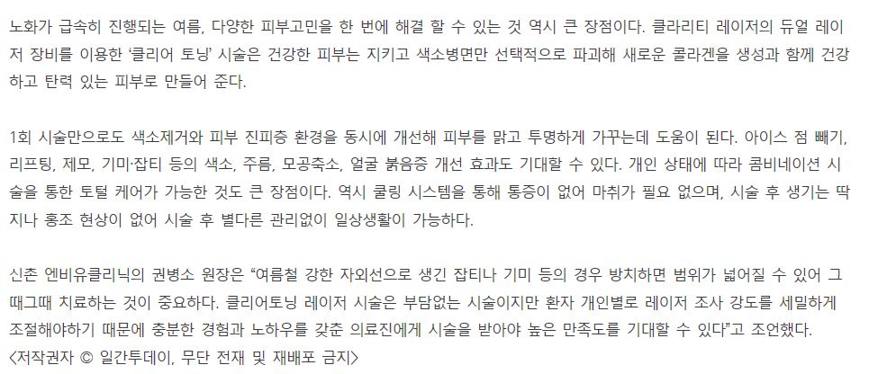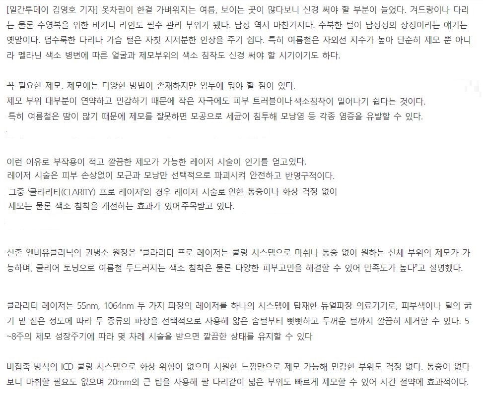 | [일간투데이] 여름철 색소침착·제모 고민? 클라리티 프로 레이저로 마취 없이 COOL하게 | |||