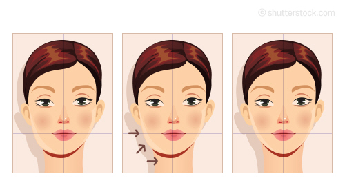 이 경우 어떻게 교정해야할까. 먼저 좌측으로 치우친 턱끝은 우측에 살짝 필러를 넣어줌으로써 중앙으로 위치하게 한다. 좌측 아래로 늘어진 지방은 제거 후 리프팅을 해서 우측과 비슷하게 맞추고 꺼진 좌측의 볼살은 지방이식이나 필러로 채워준다(두 번째 그림).