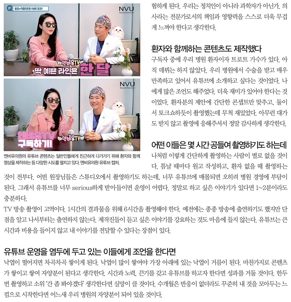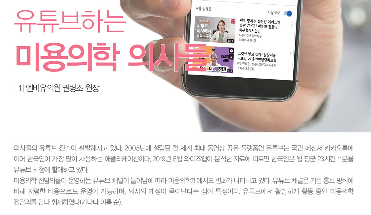 2005년에 설립된 전 세계 최대 동영상 공유 플랫폼 유튜브는 국민 메신저 카카오톡에 이어 한국인이 가장 많이 사용하는 애플리케이션입니다. 2019년 8월 와이즈앱이 분석한 자료에 따르면 한국인은 월 평균 23시간 11분을 유튜브 시청에 할애하고 있습니다. 이러한 가운데 최근 한잡지사 D&PS이슈에 '유튜브하는 미용의학 의사들'라는 주제로 엔비유성형외과 권병소원장님을 취재한 내용이 실렸습니다.
