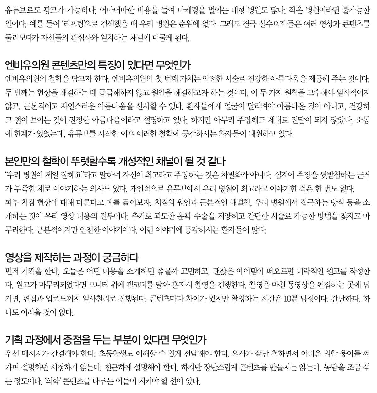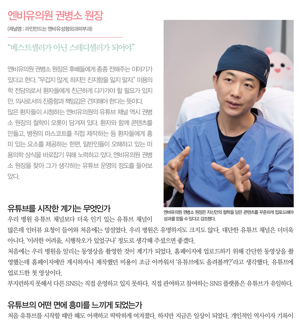 의사 유튜버 권병소원장님 유튜브 하는 법에대해 "기대치가 너무 높다. 처음 유튜브를 시작하면 많은 사람들이 볼 것 같지만 사실은 그렇지 않다"라고 말하며 "유튜브가 활성화되려면 일단 콘텐츠가 쌓여야 한다. 지금 운영하고 있는 유튜브 채널도 마찬가지이다. 처음 시작해서 구 독자가 100명이 되기까지의 시간과, 100명에서 지금까지의 구독자가 모이기까지 걸린 시간이 같다. 끈기가 필요하다."라고 설명했습니다. 또한 "실수요자들은 여러 영상과 콘텐츠를 둘러보다가 자신들의 관심사와 일치하는 채널에 머물게 된다." 유튜브를 통해 의사 유튜버로서 신뢰를 쌓는 것이 중요하다고 말했습니다. 의사 유튜버 권병소 원장은 엔비유TV 콘텐츠만의 특징이 있다면 무엇인가 에 대한 질문에 "엔비유의원의 철학을 담고자 한다."라고 답하며 "엔비유의원의 첫 번째 가치는 안전한 시술로 건강한 아름다움을 제공해 주는 것이다. 두 번째는 현상을 해결하는 데 급급해하지 않고 원인을 해결하고자 하는 것이다. 이 두 가지 원칙을 고수해야 일시적이지 않고, 근본적이고 자연스러운 아름다움을 선사할 수 있다."라도 덛붙혔습니다.