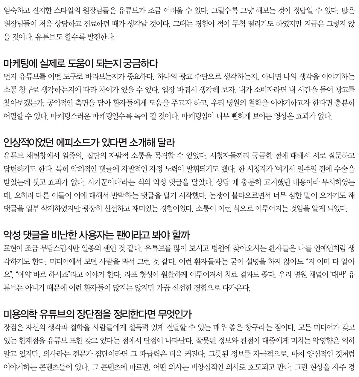 의사 유튜버 권병소원장은 "처음 유튜브를 시작할 때만해도 어색하고 딱딱하게 여겨졌다. 하지만 지금은 일상이 되었다. 개인적인 역사이자 기록이라고 생각하고 있다. 미용의학에 대한 나의 철학을 담아 우리 병원의 이야기로 풀어나가는 과정이 흥미롭다." 라고 말하며 "개인적으로 환자를 상담한다고 생각하면서 촬영한다. 내 앞의 환자에게 이야기하듯 말이다. 유튜브에 올라온 대부분의 콘텐츠는 전부 환자에게 설명하던 내용을 정리한 것이다. " 라고설명했습니다.