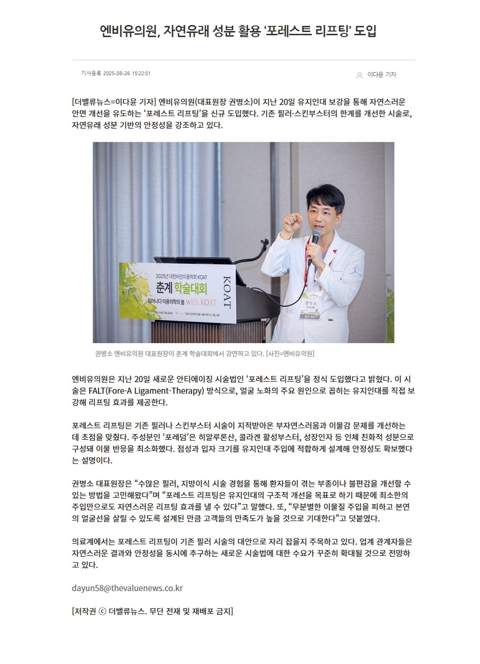 | 엔비유의원, 자연유래 성분 활용 '포레스트 리프팅' 도입 | |||