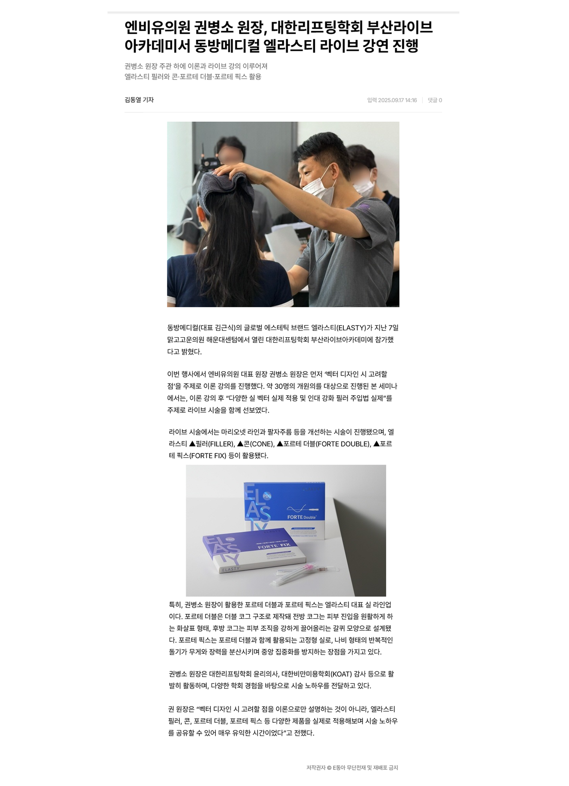 | 엔비유의원 권병소 원장, 대한리프팅학회 부산라이브 아카데미서 동방메디컬 엘라스티 라이브 강연 진행 | |||